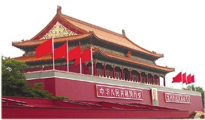 1949年9月30日下午6时,当夜幕将要降临时,参加政协会议的全体代表来到天安门广场,参加人民英雄纪念碑的奠基典礼。这场戏采用的是象征性的处理手段,画面呈现出一种带有历史感的色彩,黄昏中的松柏、基石和庄严肃立的领袖们,伴随毛泽东宣读碑文的画外音和深沉的主题音乐,一锹锹沙土从不同角度缓缓洒落而下,把对革命先烈的悼念之情,融合在富于造型表现力的画面中。当镜头仰拍基石和太阳的画面出现时,叠化山冈上无数牺牲的先烈,再叠化飞翔的和平鸽,运用这种动静交织、情景交融的浪漫主义的方法,显示了独特的神韵,达到了鼓舞观众的艺术效果。